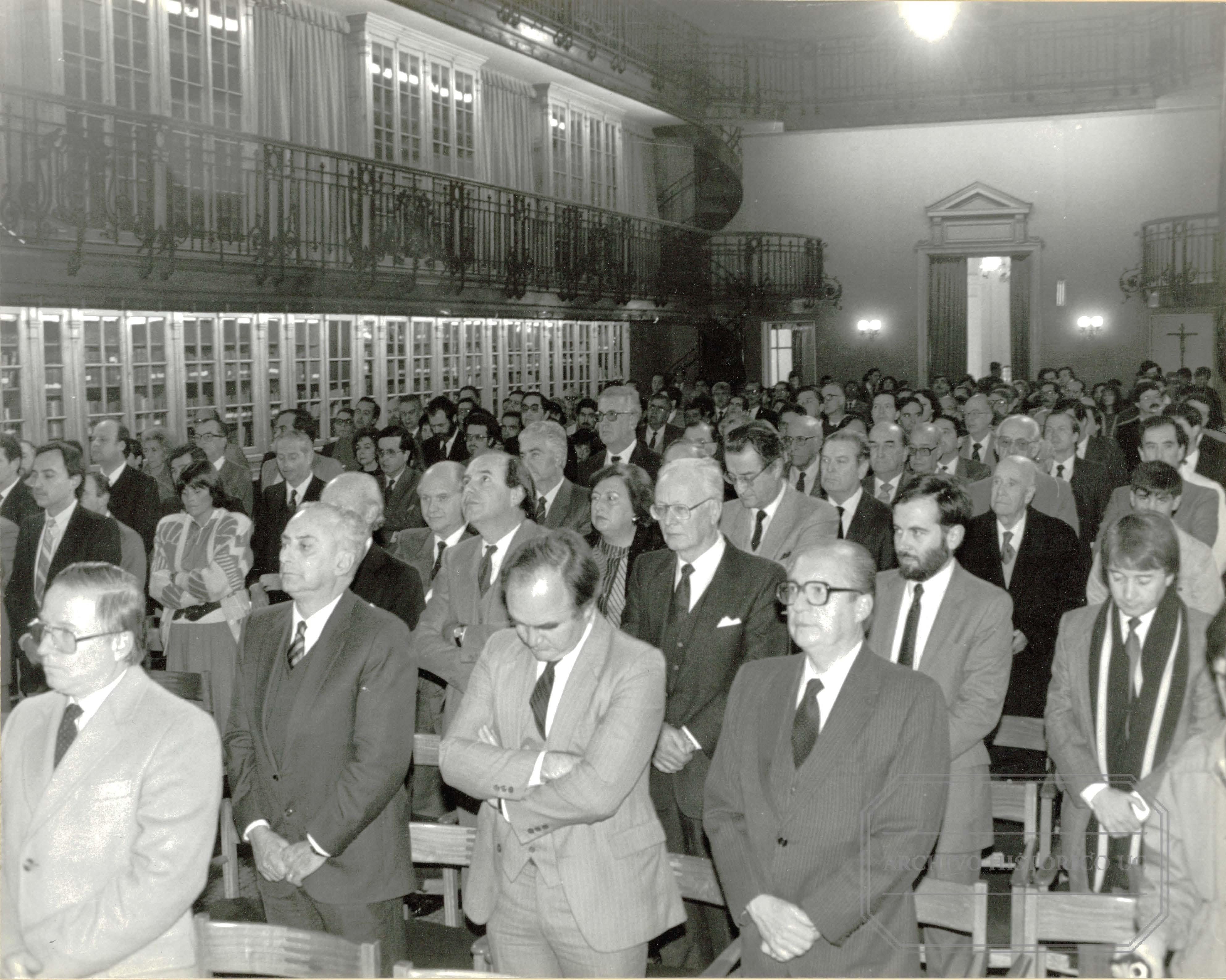Acto de Conmemoración Día de la Universidad en el Año del Centenario Solemnidad Litúrgica del Sagrado Corazón de Jesús. Vista parcial del Aula Magna. En primera fila, el Dr. Juan Giaconi Gandolfo, Ministro de Salud. En la segunda fila: Dr. Ricardo Ferreti Daneri, Decano de Medicina; don Bernardo Domínguez Covarrubias, Decano de Ingeniería; don Jaime Martínez Williams, Decano de Letras. En la tercera fila: don Gabriel Gyarmati Kardos, Decano de Ciencias Sociales; don Juan Ignacio Domínguez Covarrubias, Decano de Agronomía; Don Ricardo Krebs Wilckens, Decano de Historia, Geografía y Ciencia Política; Don José López Tarrés, Decano de Matemáticas; don Oscar Velásquez Gallardo, Decano de Filosofía. En la cuarta fila: don Renato Albertini Bortolameolli, Decano de Ciencias Biológicas; doña Josefina Aragoneses Alonso, Decano de Educación, don Rafael Gana Ostornol, Decano de Química. En la quinta fila: don Arnaldo Gorziglia Balbi, Decano de Derecho; don Fernando Castillo Velasco, ex Rector. |